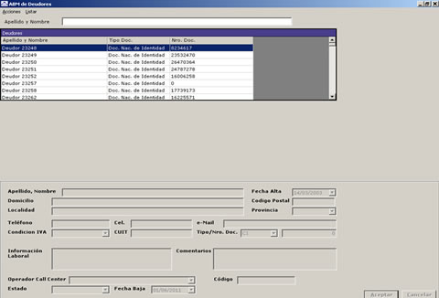 - Ingreso de deudores asociados a un cliente, cartera y producto adeudado para el reclamo de pago.
