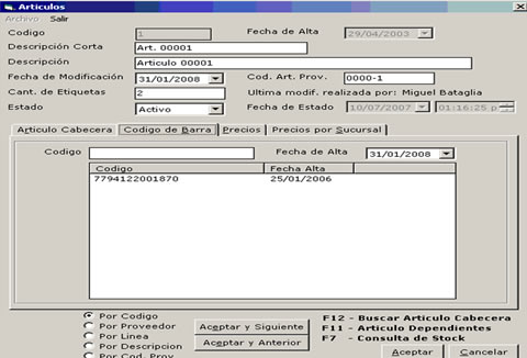 - Emisión de etiquetas con Códigos de Barras - individuales , por altas o modificaciones de artículos y precios, seleccionando atributo de artículos.