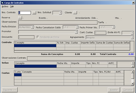 - Ingreso de Contratos asociados a una reserva detallando las condiciones de pago, las cuotas y valores para la generación automática de la facturación.